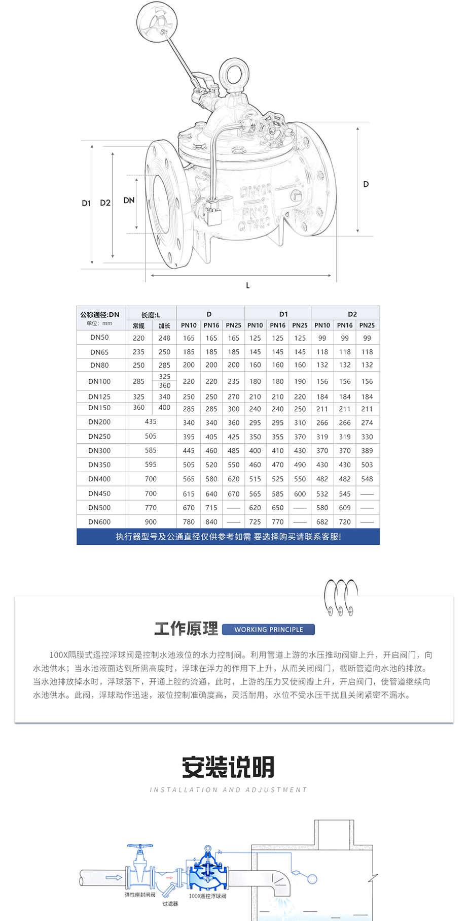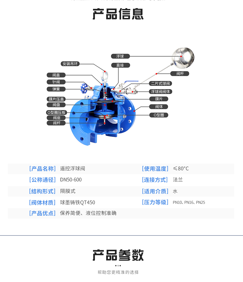 100X遙控浮球閥由主閥、針閥、球閥、浮球閥、微型過濾器等組成水力控制接管系統,調定后,自動控制液面高度。100X遙控浮球閥直接利用液面控制,不需要其它裝置和能源,保養簡便,液面控制準確度高,不受水壓影響,密封可靠。100X遙控浮球閥廣泛用于高層建筑、生活區等供水管網系統的水塔、水池等設施的液面控制。 |